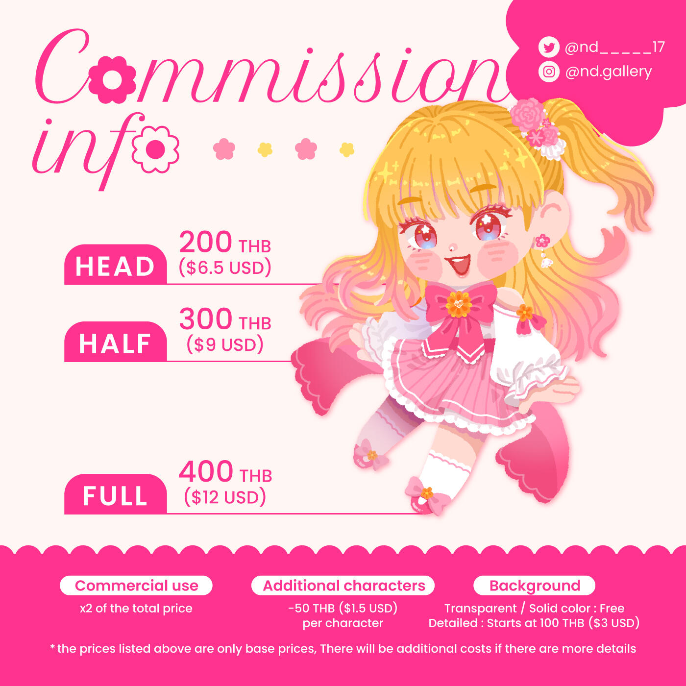 • The above prices are for personal use only. If you want to use for Commercial purposes, the price will be x2 of the total price.• ราคาที่ระบุไว้เป็นราคาเบื้องต้น หากงานมีรายละเอียดมาก อาจมีบวกเพิ่มตามความเหมาะสม